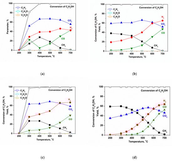 Figure 7a shows a typical dependence of the conversion of ethanol and the yield of the reaction products in ATP of C2H5OH on temperature. It can be seen that in the presence of the Ni catalyst, the conversion of ethanol to a hydrogen-containing gas increased with an increase in the reaction temperature, reached 100% at 400 °C, and then did not change (Figure 7a). The main reaction products are H2, CO, CO2, and CH4. Ethylene, acetaldehyde, and acetone were present in the reaction products in trace amounts only at T = 300 °C. With an increase in the reaction temperature from 200 to 700 °C, the hydrogen yield increased from 0 to ~43%. The yield of methane (YCH4) reached a maximum at a reaction temperature of 400 °C, and then at an increase in the reaction temperature decreased and became less than 1% at a T = 700 °C. The CO yield (YCO) increased over the temperature range 400–700 °C, and was equal to ~40% at 700 °C. The behavior of the temperature dependence of YCH4 and YCO indicated an increase in the contribution of the reaction of steam conversion of methane with increasing temperature. The curve of the dependence of the CO2 yield (YCO2) on temperature passed through a maximum (~67%) at a reaction temperature of 400–500 °C.