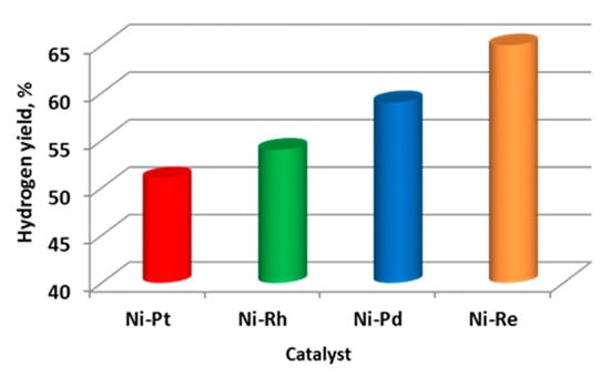 At 600 °C, the hydrogen yield increased in the next row of promoters Pt < Rh < Pd < Re at 100% conversion of ethanol (Figure 8). For the Ni-Re sample, the obtained parameters of ATR reaction were close to thermodynamic equilibrium values, and the maximum H2 yield (65%) was attained (Figure 7 and Figure 8).