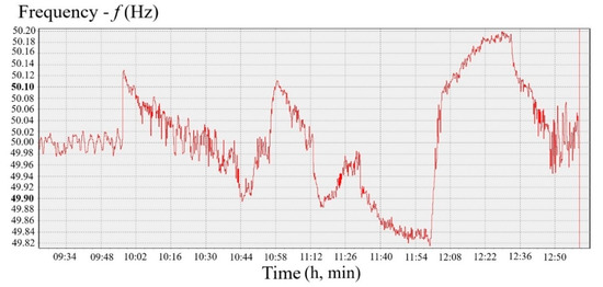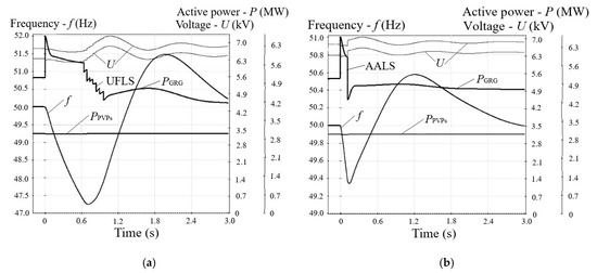 Figure 1a shows a transient process caused by the disconnection of several gensets (three gas-reciprocating gensets, 2 MW each) in an islanded operation. One 2 MW gas-reciprocating genset (GRG) and two photovoltaic power plants with frequency-dependent power control with a capacity of 2 MW each remain in operation. This situation causes a significant active power shortage and frequency decrease to 47.3 Hz, which triggers 13 stages of under-frequency load shedding (UFLS) with a disconnection of 29% of load with respect to the initial value.