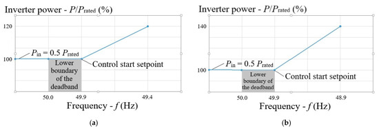 The mandatory participation of PVPs in general primary frequency control is implemented by automatically reducing active power supplied to the network under frequency increases in the power system [49,50,51]. This function can be performed by the generating equipment control devices, DC link, or through the disconnection of part of PVP generating equipment [52,53,54].
