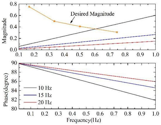 Combined with the monotonically relationship analyzed above, it can be concluded from the Table 2 that if the magnitude-frequency characteristic of the input sensitivity function drops below 0.303 when the input disturbance frequency is 3/4 Hz, the control performance of DOBC could meet the inspiratory resistance threshold. The volume of breath chamber was set as 0.3 L, and the temperature was set as 293.15 K, so the coefficient b was calculated as 378.6 kPa/(g/s). The damping coefficient was selected as 0.707, and the natural frequencies were set as 10 Hz, 15 Hz, and 20 Hz, respectively. The Bode diagram of input sensitivity function was drawn in frequency range less than 1 Hz, as shown in Figure 3.
