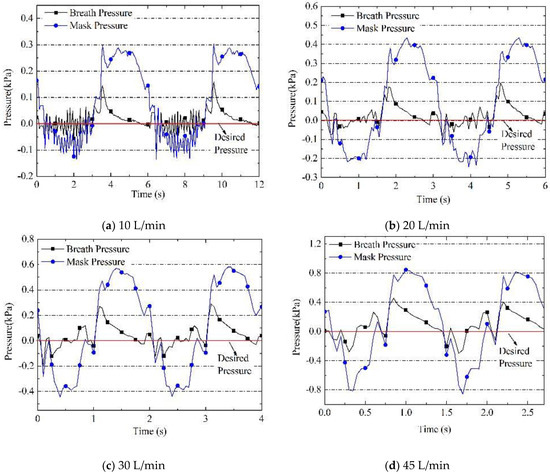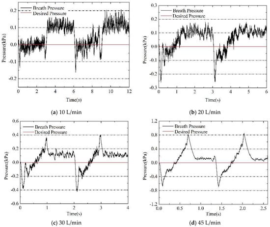 The desired pressure was set as 0 kPa to simulate the normal breath process. Figure 4 shows the dynamic curves of breath pressure under the control of DOBC for four different pulmonary ventilation rates of 10 L/min, 20 L/min, 30 L/min, and 45 L/min, respectively.