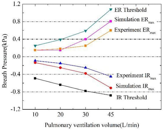 The normal breathing processes of four pulmonary ventilation volume were simulated by using the active servo lung. The recorded experimental results of breath pressure and mask pressure were shown in Figure 8. In addition, the maximum values of inspiratory resistance (IR) and expiratory resistance (ER) obtained from simulation and experiment were compared in Figure 9 with the thresholds in Table 1. It could be found that the control parameters of DOBC designed based on the frequency domain analysis could make the respiratory resistance under each pulmonary ventilation volume meet the threshold requirements of IR and ER. Combined with the mask pressure curve in Figure 8, the breath pressure was kept relatively stable and the pressure variation in mask was mainly affected by the flow resistance of the check valve on mask. This indicates that the pilot will have a good breath experience and not suffer from breathing fatigue.