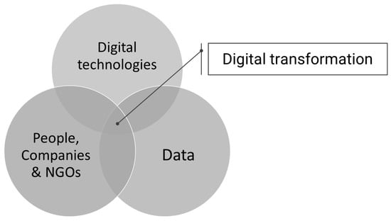 Recently, a number of papers—both theoretical and application themed—have focused on searching for potential factors that strengthened the direction of the transformation of cities more toward “smart” cities. These factors can be grouped into threads related to governance and digital technologies []. The approaches related to governance are focused on management and interactions among various city stakeholders, in particular, on combining and developing links between networks of city entities that target productivity, social aspects and, also, innovations. In contrast, the approaches related to technology—primarily digital technology—are aimed at improving the efficiency of services and infrastructure (for example, communications, transportation, and supplies). The evolution of the perception of digital technologies in the context of developing smart cities has been emphasized in []. A number of smart city projects carried out earlier this decade were focused on developing smart infrastructure (equipped with sensors). Newer approaches have a tendency to focus on creating added value for citizens, companies, and NGOs thanks to digital solutions and the processing of applicable data, including open data (i.e., we are dealing with components used to implement digital transformation; see Figure 2).