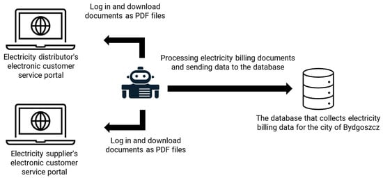 At the same time, the authors are aware of the disadvantages of such an approach, in particular, of narrowing down the analysis to a single case study []. Certain difficulties may arise in a case study, for example, a lack of openness by the respondents or a low level of communicativeness. In addition, misinterpreting the obtained information is possible. Furthermore, the literature on the subject includes recommendations that between 2 and 15 use cases should be analyzed; hence, the authors of the article concluded that the conducted research is preliminary and that further work is required. Narrowing down the analysis to a single case study was due to the fact that only one city in Poland has a software robot deployed in the production environment that is used to process electricity billing documents. Apart from Bydgoszcz, the subject of this analysis, only one other city, Łódź, has a software robot, which is used in the Social (Public) Participation Office []. According to the authors, this indirectly demonstrates the innovative nature of the implementation presented in the article.