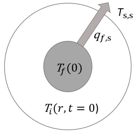 Let us first assume that the supply pipe temperature and the soil temperature have been constant for a couple of days before the shutdown (see Figure 1). The impact of a non-stable temperature history and of short-term temperature variations on the time scale of hours and days will be investigated later in Section 2.1.3. The supply fluid temperature before time zero, i.e., the time of shutdown, is denoted (K); the corresponding temperature in the surrounding insulation is denoted (K), while the immediately surrounding soil temperature is . The quasi-steady-state heat flow through the pipe and into the soil is (W/m). The heat loss is balanced by the heat release due to the temperature drop along the length of the pipe, .