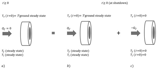 Figure 2 shows how the heat transfer, after the shutdown, can be analysed by superposing two separate processes. The first panel on the left (a) depicts the total transient thermal problem to be solved. In the first process, shown in panel (b), the heat loss to the soil from the pipe at time zero, , continues to be balanced by the heat supply, . Additionally, as the initial temperature inside the pipe is the same as for the total process, the pipe temperatures will be the same as those before the shutdown. The second process in Figure 2, shown in panel (c), then needs to have a negative heat source, , to cancel out the heat supply, which must be zero after shutdown for the total process. The initial temperature inside the pipe is zero for the second process.