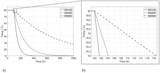 The required shutdown time depends on the dimensions of the pipes, due to the heat capacity of the water volume in the pipe and the insulation thicknesses and thermal properties. Previous work [6] indicates that a minimum of approximately 1–2 °C of temperature decline during the shutdown is required for a high-accuracy analysis, which partly depends on the use of high-precision measurement equipment. Figure 3 shows examples of the decline in the supply water temperature. The decline is approximately exponential, with a rapid temperature change at the beginning when the temperature difference between the water and the casing pipe/soil is large and slow when the temperature difference becomes smaller throughout the cooling phase. The supply temperature is assumed to be constant prior to shutdown. As seen in Figure 3, larger-dimension pipes such as DN500, in which the nominal diameter (i.e., the actual supply pipe diameter) is 508 mm, require approximately 8 h of shutdown time to reach a ΔT of 1 °C, whereas smaller-dimension pipes, such as DN100, require only 1 h to reach a ΔT of 1 °C (see Figure 3a,b).