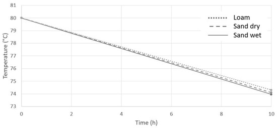To analyse the impact of the surrounding soil on the temperature decline after shutdown, the heat transfer process is simulated numerically using FDM in MATLAB as described above, now also accounting for the soil outside the DH pipe, extended to infinity. A starting soil temperature of 10 °C is assumed (annual mean temperature at the location) and the soil types are wet sand, dry sand, and loam, with a large range of thermal properties (see Table 1 and Figure 4).