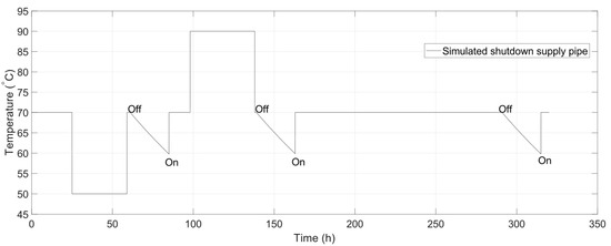 The network part under assessment extends from points B to D. Measurement data from the field test are shown in Figure 11, together with the three shutdowns and openings of the supply water, marked “off” and “on”, respectively. Furthermore, the supply pipe temperature was measured by the energy company [16] at several nearby customers, with B being of greatest interest as it was closest (400 m) to the measurement point, manhole C (see Figure 9).
