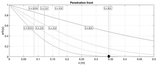 The results presented in Figure 7 indicate that, after 0.5 h, the heat front has reached 0.35 m into the material; however, this represents a small proportion, less than 1%, of the total possible temperature change. It takes 8 h for half the possible temperature change to occur at approximately the same depth (see the black dot).
