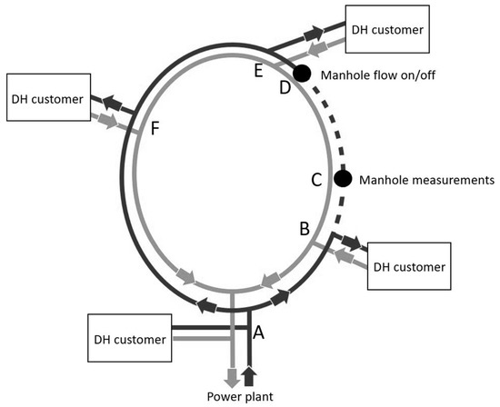 Pipe network and measurement location C (i.e., valves). Normal flow direction is A–E. During shutdown at valve point D, the flow between B and D (dashed line) stops. Supply water is shown in black and return water in grey.