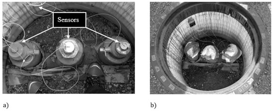 Thermocouple positions are shown in Figure 10a: one on the steel top of the right drainage valve, one on top of the central shutdown valve, and one on the side of the steel top of the left drainage valve. In addition, one thermocouple was placed on the side of the manhole to capture the surrounding air temperature. After attachment of the thermocouples, “hats” of 20-mm mineral wool were placed to cover the top part of the valves (see Figure 10b).