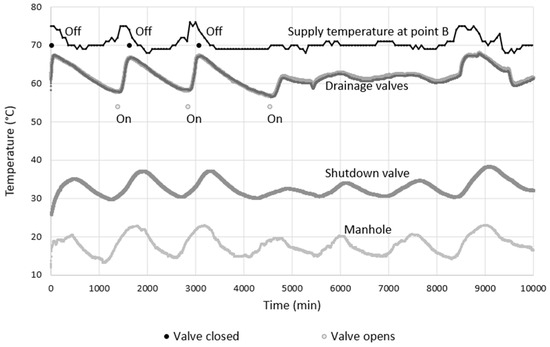 It should be noted that the flow takes another path between the DH customers during shutdown, so only the supply temperature between openings and closures is of interest. The results presented in Figure 11 show that the valve responses to shutdowns differ between the drainage valves and the shutdown valve. Sharper temperature changes can be seen for the drainage valves, while the shutdown valve indicates smoother changes, more in line with the manhole temperature. Furthermore, the manhole temperature also varies with shutdowns as well as being influenced by daily changes in air temperature.