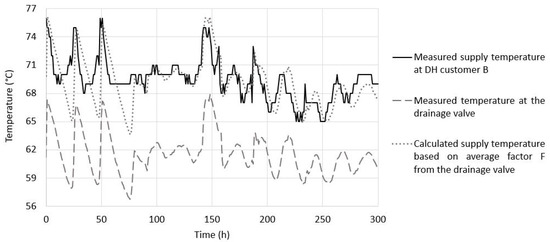 The results presented in Table 3 indicate that the drainage valve temperature matches the supply temperature much better than does the shutdown valve temperature. However, the drainage valve and shutdown valve sensors were equally insulated, meaning that the design and material properties of the different valves have a great impact on the resulting temperatures. The supply temperature in the DH pipe below the valves can now be calculated using factor F. In Figure 12, the drainage valve measurement and its factor have been used to calculate the supply temperature. Results show that the deviation between measured and calculated supply temperature is approximately 1%.