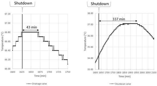 Thermal response time from shutdown to temperature decline for the drainage valve (left panel) and shutdown valve (right panel); temperature data from the second shutdown, at 1627 min.