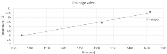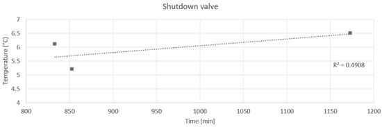 The measured temperatures of the drainage and shutdown valves during shutdown are presented in Figure 11. A closer look at the temperature decline phases during the shutdowns for the drainage valve reveals a linear temperature decline with time (see Table 4 and Figure 14).
