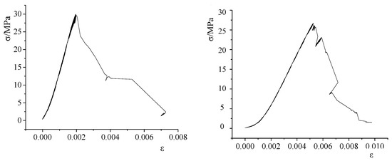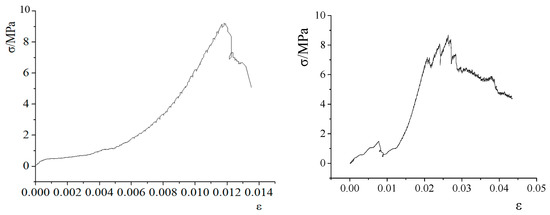 The rock mass strength is the intrinsic factor affecting the stability of the roadway surrounding rock. To obtain the strength, deformation and the failure characteristics of the roof rock mass under uniaxial compression, rock cores are taken from the deformation and failure section of the roadway and tested on a rock mechanics testing machine [32]. The stress–strain curves of mudstone and siltstone specimens under uniaxial compression are shown in Figure 4 and Figure 5, respectively.
