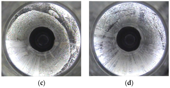 From Figure 6, it can be seen that the rock mass located 0–0.6 m above the roof of the roadway is relatively fragmented, and longitudinal cracks are developed. The rock mass located at 0.6–2.8 m contains many types of cracks, such as longitudinal cracks, transverse cracks, and cross cracks, and they are relatively developed. The area at 2.8 m mostly consists of annular cracks, but local fragmentation also occurs. Annular cracks and longitudinal cracks develop at 3.4–4 m on the roof of the roadway, and microcracks develop from 4–5.6 m.