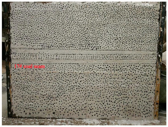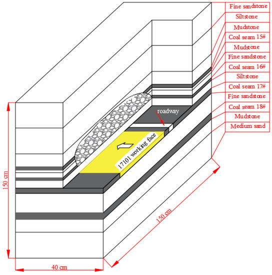 The similar simulation test frame in this experiment has a length of 1.5 m, a width of 40 cm and a height of 1.5 m. The periphery of the model and the bottom plate can be strongly restrained by the steel channel of the similar simulation test frame. The matching ratio of similar materials in each rock formation in this physical simulation experiment is the best result obtained after many experiments, as shown in Table 1. Simulate different lithology materials with different matching ratios, using gypsum and lime as cementing aterials, sand as aggregates [33,34]. The model is laid according to the geometric similarity ratio 1:100, the bulk density similarity ratio 1:1.6 and the time similarity ratio 1:10. The final laying model height is 1.2 m (see Figure 7). In this model, a total of four coal seams have been laid, among which coal seams 15#, 16#, and 17# belong to close-distance coal seams. In the actual engineering background, coal seams 15# and 16# have been mined and coal seam 17# is being mined. After the model is laid, the upper coal seams are mined in sequence to simulate the upper goaf. Then the coal seam 17# was mined to observe the fracture characteristics of the roof and the displacement of the surrounding rock of the roadway of the coal seam 17# after being affected by repeated mining. The model is a three-dimensional similar model. In the simulation process, the length and width of the model are the simulated coal seam working face layout direction and the working face forward direction respectively. That is, the simulated working face will advance 40 cm in length (actual advance 40 m) to observe the deformation and failure of the roadway.