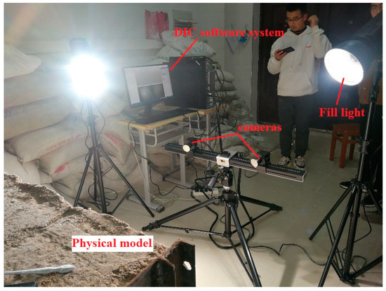 The experiment uses a three-dimensional digital image correlation strain measurement and analysis system to calculate the strain and deformation of the whole field when the model is excavated. The three-dimensional digital image correlation strain measurement and analysis system has a flexible and easy-to-use trigger function, rich external software and hardware interfaces, and the strain measurement range can be varied from 0.01% to 1000%. It adopts the digital image correlation method and uses two high-speed cameras to collect real-time speckle images of physical objects deformed in various stages. The relevant algorithm is used to match the displacement of the object with the stereo to realize the visual analysis of the displacement field data, so as to achieve the rapid, high-precision, and real-time experimental requirements, as shown in Figure 8.