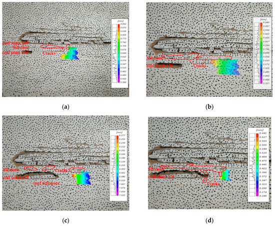 It can be seen from Figure 11a that the roof of the working face is basically stable, the overlying rock layer has not collapsed, and no obvious cracks appear. The DIC system monitors that the surrounding rock of the roadway begins to move, and the farther away from the working face, the smaller the displacement. Due to the change of the stress environment in front of the working face and the goaf above the coal seam 17#, which has a certain disturbing effect on the surrounding rock, the maximum displacement at this time is 3.902 mm. According to the geometric similarity ratio of 1:100, the surrounding rock of the roadway has a displacement of 39.02 cm.