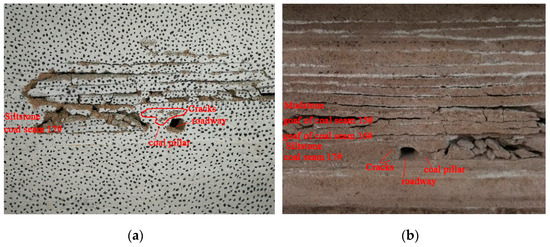 Figure 12b shows the deformation and failure of the surrounding rock of the roadway under the influence of mining behind the model. At this time, there have been obvious cracks in the roof above the roadway. In addition, there are obvious cracks in the coal pillar of the roadway protection, and there are also obvious cracks in the solid coal body, and the stability of the surrounding rock of the roadway is poor.