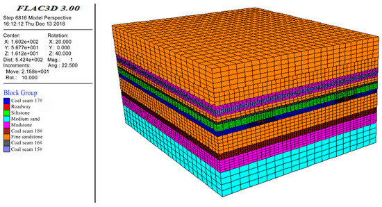 The stress of the surrounding rock is the external factor that affects roadway stability, and it is the main factor determining roadway failure. To obtain the stress distribution characteristics around the roadway under repeated mining, the maximum and minimum principal stresses around the roadway after mining coal seams #15 and #16 are simulated using FLAC3D. The mechanical parameters of the coal and rock mass are shown in Table 2. The numerical model is shown in Figure 13. The left and right boundaries, front and back boundaries, and lower boundaries of the numerical model adopt rolling boundary conditions. The length, width, and height of the established model are respectively 200 × 200 × 120, representing an actual length of 200 m; a width of 200 m; and a height of 120 m. The working face length is 120 m, and in order to eliminate the boundary effect, a width of 35 m is left at each end of the model. In addition, between the roadway and the working face, there is a 10 m-length coal pillar for roadway protection. Using the Mohr Coulomb constitutive model, horizontal constraints are added to both the front, back, left, and right boundaries of the model, so that the horizontal displacement of the front, back, left, and right boundaries is 0. The bottom boundary of the model also writes the corresponding command to make it immobile, so that the horizontal displacement and vertical displacement of the bottom boundary are both 0. The vertical stress on the upper boundary is calculated according to the gravity of the overlying rock. Since the distance from the upper boundary to the ground surface in the actual engineering background is 494.5 m, the calculated vertical stress should be 12.36 MPa. The horizontal stress of the front, back, left, and right is considered according to the hydrostatic pressure.