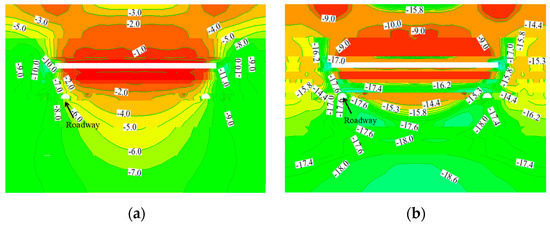 (2) After coal seams 15# and 16# are mined, the pressure of coal seam 17# is further decompressed, and the stress concentration degree is reduced accordingly. However, the horizontal distance between the roadway and the edge of the coal pillar is 10 m, which is close to the coal pillar. Affected by the stress concentration degree of the coal pillar, the minimum principal stress at the mining roadway axis is −6.0 MPa, the maximum principal stress is −18.6 MPa, and the maximum principal stress is approximately 3.1 times the minimum principal stress.