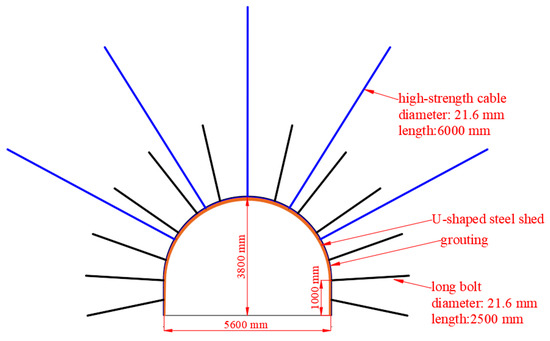 To address the instability characteristics of the roadway surrounding rock, a U-shaped steel shed and grouting support are added on the basis of the original bolt-cable support, as shown in Figure 16. The shallow surrounding rock of the roadway under the repeated mining of close-distance coal seam groups is relatively fragmented, resulting in a significant reduction in its ability to transmit horizontal stress and causing failure to the deep surrounding rock. The use of high prestressing long bolts to support the roadway can form a prestressing bearing structure with a certain thickness and limit the formation of new failure to the surrounding rock outside the anchorage area. Using a high-elongation anchor cable to reinforce the surrounding rock can provide a high-pressure stress to the roadway surrounding rock and form a skeleton network structure with a compressive stress zone of shallow anchor, which makes the prestressed bearing structure have a greater stiffness and greatly improves the ability to resist a high horizontal stress. The U-shaped steel shed can provide enough support resistance to the surrounding rock during the deformation process and closely contact the whole section of the surrounding rock, it can evenly transfer a high horizontal stress to the support to avoid serious failure of the surrounding rock due to stress concentration. The grouting reinforcement of the surrounding rock and the grouting fluid used to improve the stress state of the surrounding rock increase the anchor ability, integrity, and strength of the surrounding rock while uniformly distributing the surrounding rock stress.