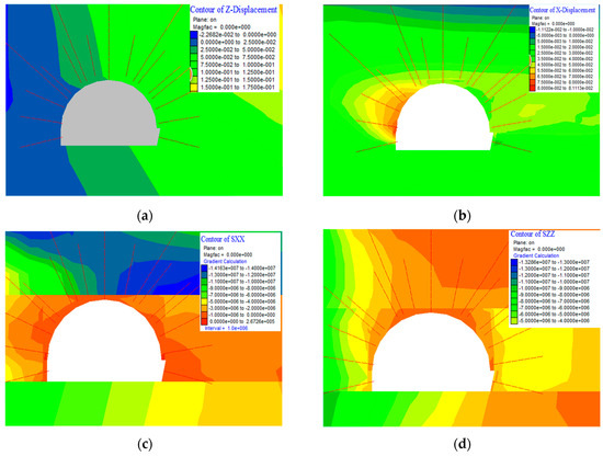 To obtain the control mechanism of the roadway surrounding rock of the repair scheme and the actual effect of this control technology (i.e., long bolt + high-strength anchor cable + U-shaped steel shed + grouting) under repeated mining, considering the geology and mining conditions of the mine’s close-distance coal seam groups, the distribution characteristics of the stress and displacement of the roadway surrounding rock are simulated using FLAC3D. The simulation process is consistent with the previous Section 3.4, but the parameter assignment of the different support scheme to be proposed is fully considered in the modeling process. The control effect diagram of the roadway surrounding rock is shown in Figure 17.