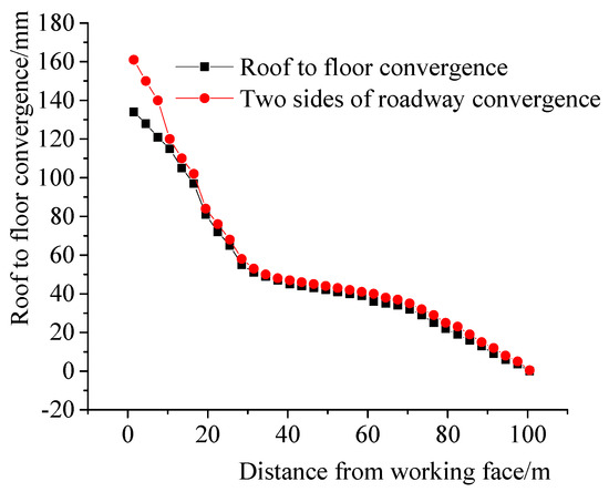 It can be seen that, when the distance of the measuring points from the coal face is 100 m, the convergence of the roof to the floor and the two side ribs of the roadway is very small. As the excavation of the coal seam, due to repeated mining, the displacement of the roof to the floor and the two side ribs of the roadway gradually increases. The maximum convergence of the roof to the floor is 134 mm, the maximum convergence of the two sides of the roadway rib is 161 mm, and the deformation amount of the roadway surrounding rock is within the safe and controllable range.
