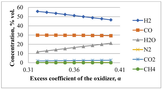 There are numerous works devoted to the study of the α influence on the composition of the gas obtained as a result of the partial oxidation of hydrocarbon raw materials [27,28,29]. Figure 1 and Figure 2 show some calculation results for the following conditions: raw materials—humidified natural gas (CH4—97.57 % vol., C2H6—1 % vol., C3H8—0.37 % vol., C4H10—0.15 % vol., N2—0.84 % vol., CO2—0.07 % vol.), humidity ratio of raw materials is 15% mass of water vapor to mass of natural gas; oxidizer is oxygen; pressure in the synthesis gas generator combustion chamber is 6.0 MPa; initial temperature of oxidizer heating is 170 °C, natural gas—450 °C [30,31,32].