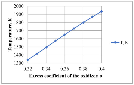 Dependence of gas temperature on the excess coefficient of the oxidizer.