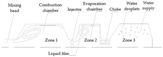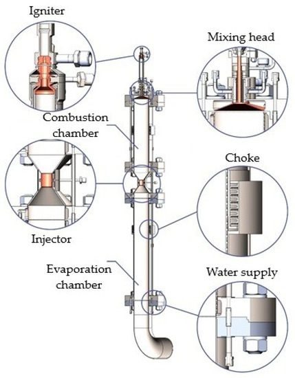 An SGG consists of the following main units: an igniter, a mixing head, a combustion chamber, an injector, and an evaporation chamber [26]. The most complex element of the SGG is the mixing head. It influences the conditions of mixture formation when the components of the reaction are supplied to the combustion chamber. Next, the mixing head determines the SGG characteristics such as flow rate, unit efficiency, initial degree of components’ conversion, reliability, unit dimensions, and so on.