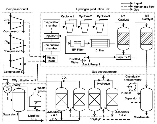 The technological scheme of the developed technology for production of “blue” hydrogen is presented in Figure 4. Installation consisted of four parts: hydrogen production unit, gas separation unit, compressor unit, and CO2 utilization unit.