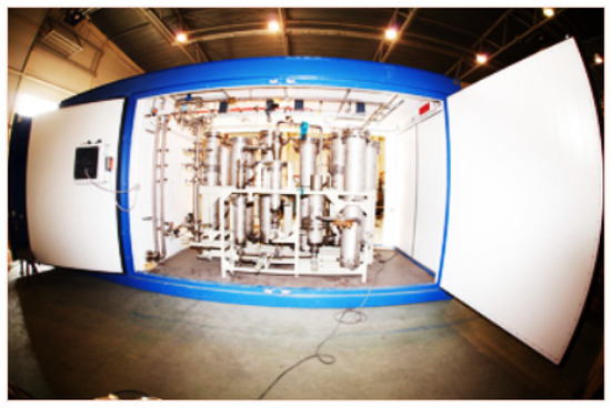 Several experimental installations were created to assess the calculated characteristics of SGGs. A pilot demonstration unit for the production of hydrogen with a capacity of 300 nm3/h (PDU-300) was manufactured according to the patent [33] by order of PJSC “Cryogenmash” [25]. The main technological module of PDU-300 was built into a standard 20-foot container (Figure 6). It contained the SGG with devices of component introduction (methane, oxygen, chemically treated water); a gas purification unit; a block of converters with catalysts (iron–chromium STK-2 and low-temperature K-CO, which contains oxides of copper, zinc, and aluminum); a refrigerator-separator; a pump block; sampling devices; and a control system with an operator’s workstation located in a separate box. Preliminary treatment of raw materials—heating and humidification of methane—was not carried out.