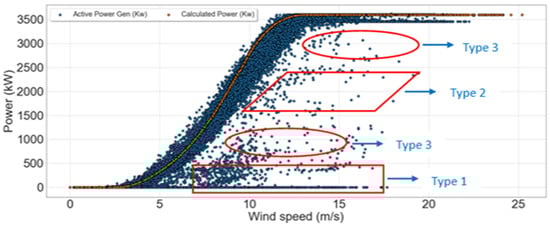 Closer examination of the wind turbine power highlighted three anomaly types in the SCADA data of the wind turbine. Type-1 anomalies are displayed in the scatterplot via a horizontal dense cluster of data where the generation of power is zero at a wind speed higher than the cut-in speed. Such anomalies generally occur due to the turbine downtime that can be cross-referenced when utilizing an operation log [49,50]. Type-2 anomalies are shown by a dense cluster of data that fall below the ideal power curve of the wind turbine. These anomalies can occur because of wind curtailment, where the turbine output power is controlled by its operator to be lower than its operational capacity. Wind restriction can be executed by operators of a wind farm due to various reasons, such as difficulty in the storage of huge capacities of wind power, a lack of demand for power at several times, and at times where volatile wind conditions cause the produced electricity to be unstable in nature. Type-3 anomalies are arbitrarily dispersed around the curve and these are generally the result of sensor degradation or malfunction, or they may be due to noise at the time of signal processing [51,52]. It is also worth noting that a segment of type-2 and type-3 anomalies can also be illustrated by the dispersion produced on account of incoherent wind speed measurements taken as a result of turbulence.