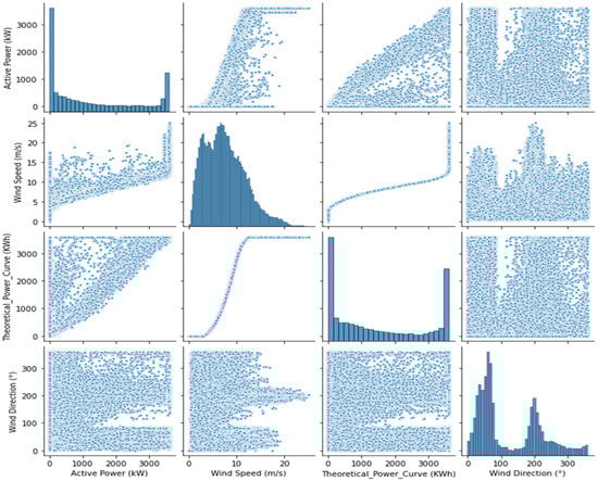 - Outlier removal: The procedure of cleaning and preparing the raw data to make it compatible for training or developing machine learning models is called data preprocessing. To limit the impact of noise and turbulence, a sampling rate of 10 min was used when processing the SCADA data; however, deep analysis of individual parameters identified certain errors in the SCADA data, such as, power production being zero above the cut-in speed (i.e., 3 m/s), negative values of wind speed, or active power and missing data at some timestamps. These results carry no practical significance in terms of the generation of power. As such, to prevent a negative impact on the forecasting, data points belonging to the same timestamp have been removed. Such erroneous data points are commonly the result of wind farm maintenance, sensor malfunction, degradation, or system processing errors. It is crucial that the SCADA data are pre-processed prior to developing the forecasting models.