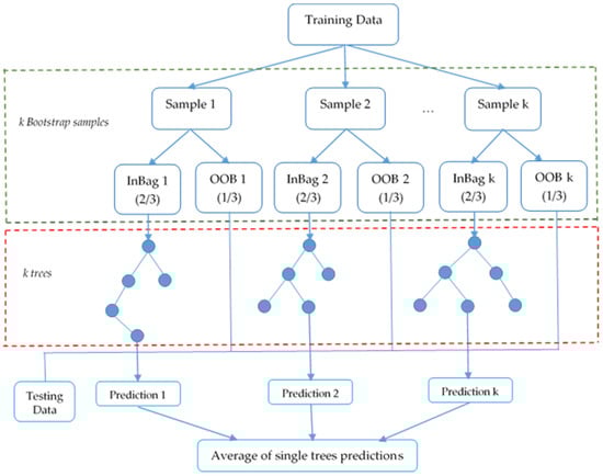 - For individual bootstrap samples, expand an unpruned regression tree, including subsequent alteration at every node, instead of selecting the best split among all predictors. Arbitrarily sample mtry predictors and then select the best split from those variables. (“Bagging” can be considered a special case of RF and where mtry = p predictors. Bagging refers to bootstrap aggregating, i.e., building multiple distinct decision trees from training dataset by frequently utilizing multiple bootstrapped subsets of the dataset after averaging the models);