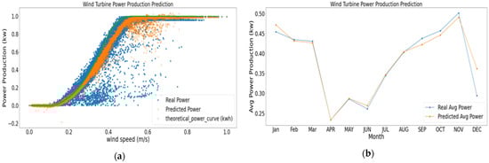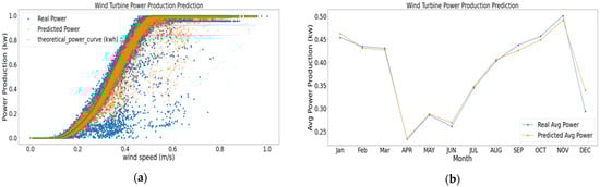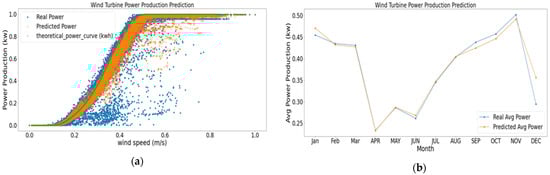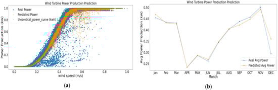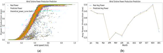 (a) Scatter plot depicting the relationship between the wind speed (m/s) and the power production (kW) of the turbine when using gradient boosting regression. (b) Predicted average power in comparison with the real average power of the turbine (kW) when using gradient boosting regression.
