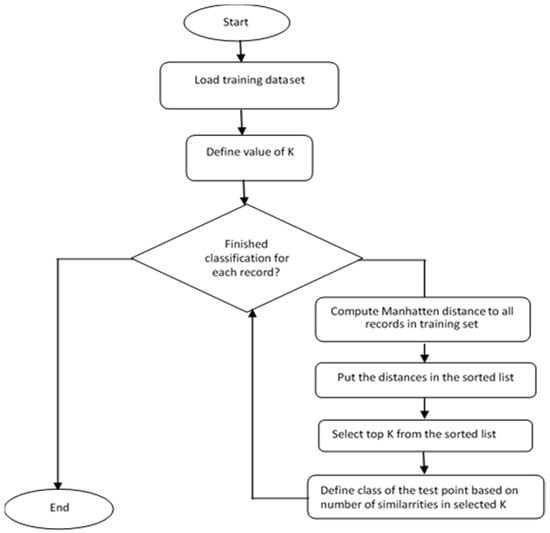where and are distances associated with the instance and the renewable power output, correspondingly. Figure 11 presents a flowchart of the k-nearest neighbor regression method. In this paper, k was selected as 7 and the Manhattan distance was chosen as the distance measure.