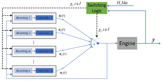 The aircraft engine is a highly complex thermodynamic system whose dynamic varies with flight conditions, operating states and component deteriorations [1]. To ensure the safety, reliability and economy, control system plays an important role in engine operation. Over the past decades, many classical control theories and advanced control techniques, such as sliding mode control, adaptive control, and control, have been proposed to improve the engine control performance [2,3,4]. However, no single model-based controller can achieve the required control effect across the flight envelope [1,2]. When multiple controllers are adopted, the scheduling using gain-scheduling or the LPV technique is not always feasible, and the stability condition based on the frozen-time theory or the common Lyapunov function method is rather conservative [5,6,7].