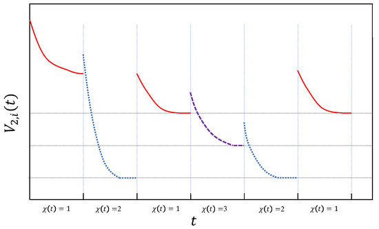 When , the i-th subsystem is active and . By substituting the designed controller (17) into (10), the closed-loop subsystem is found as: