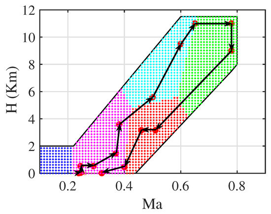 To simplify the switched system formulation, the notation is introduced. In the engine operation, the current operating state and flight conditions determine whether the subsystem is active or not. When the system trajectory enters the subregion , the i-th subsystem will be activated and will be equal to 1. In the opposite case, the subsystem will be deactivated and will be equal to 0, meaning that the subsystem state can be determined by the following indicator function: