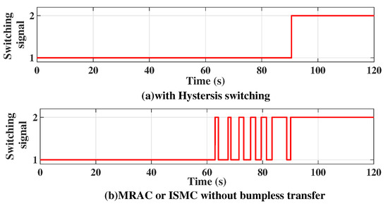 Bumpless transfer is another essential aspect of the switched system control [22,23,24]. Switching between two controllers can result in abrupt change of the control input signal. This change generally implies the existence of undesired transient behaviors which degrades the system performance. As a result, system trajectory may not simply move from one region to the other [25]; instead, the system state resides in the neighborhood around the switching boundaries, forming a high-frequency switching phenomenon between neighboring controllers. In extreme cases, those behaviors will destabilize the switched closed-loop system [22]. In model reference adaptive control (MRAC) of a switched system, the frozen parameter method was proposed to ensure the control input continuity [25,26]. In sliding mode control (SMC) of multiple loops, a smooth transition law using the natural exponential function was designed to gradually transform the control signal transmitted to engines [27]. Therefore, bumpless transfer between controllers cannot simply be taken for granted [22,28].