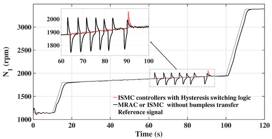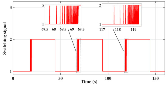 A comparative simulation was carried out to demonstrate the resetting scheme effectiveness in regards to the controller switching. Subsystem 1, Subsystem 2, and corresponding ISMC controllers were included in the simulation. Figure 9 and Figure 10 show the ISMC controller switching signals with and without resetting scheme, respectively, while Figure 11 shows the N1 history (the grey line corresponds to the switching event). In this simulation, the engine accelerates to the maximum speed in 4.97 s with almost no overshoot, and the system trajectories can simply cross the boundaries. This cannot be achieved by controllers without the resetting scheme.