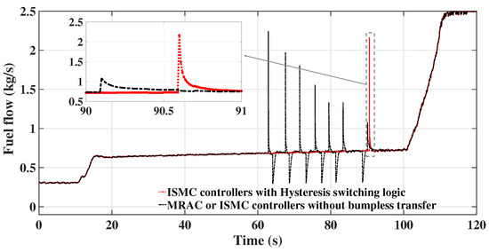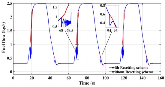The fuel flows are shown in Figure 12. It can be seen that controller transition without the resetting scheme can cause a significant control input discontinuity. As a result, the high-frequency switching phenomenon can occur. Such results suggest that the resetting scheme can help effectively avoid the input discontinuity during the controller switching.
