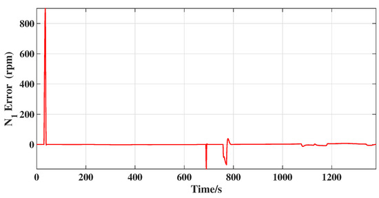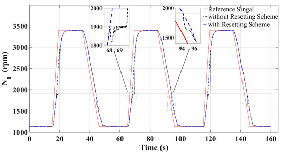 The control objective is to drive the Fan speed N1 to track the reference signal by regulating the fuel flow. To illustrate the importance of bumpless transfer between two controllers, a comparative simulation with two subsystems was performed. The operation condition was set as H = 0, = 0, and Subsystem 1 and Subsystem 2 were included in the simulation. The partitioned subregions were , . Additionally, the operating range starting from idle to maximum speed was covered.