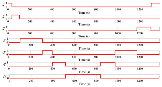 The switching signals are shown in Figure 13. When the system trajectories enter the i-th subregion, the i-th controller will regulate the fan speed . In the simulation, and denote whether the i-th controller is active or inactive, respectively. It can be seen that controllers switch at 34.5 s, 103.68 s, 307.61 s, 399.01 s, 517.17 s, 837.86 s, 993.14 s, 1174.22 s, and 1302.37 s. These seven controllers were activated when system trajectories entered the corresponding pre-assigned subregion.